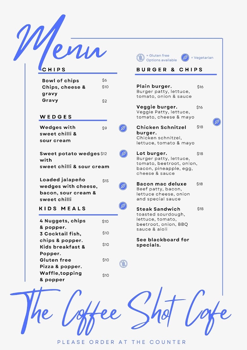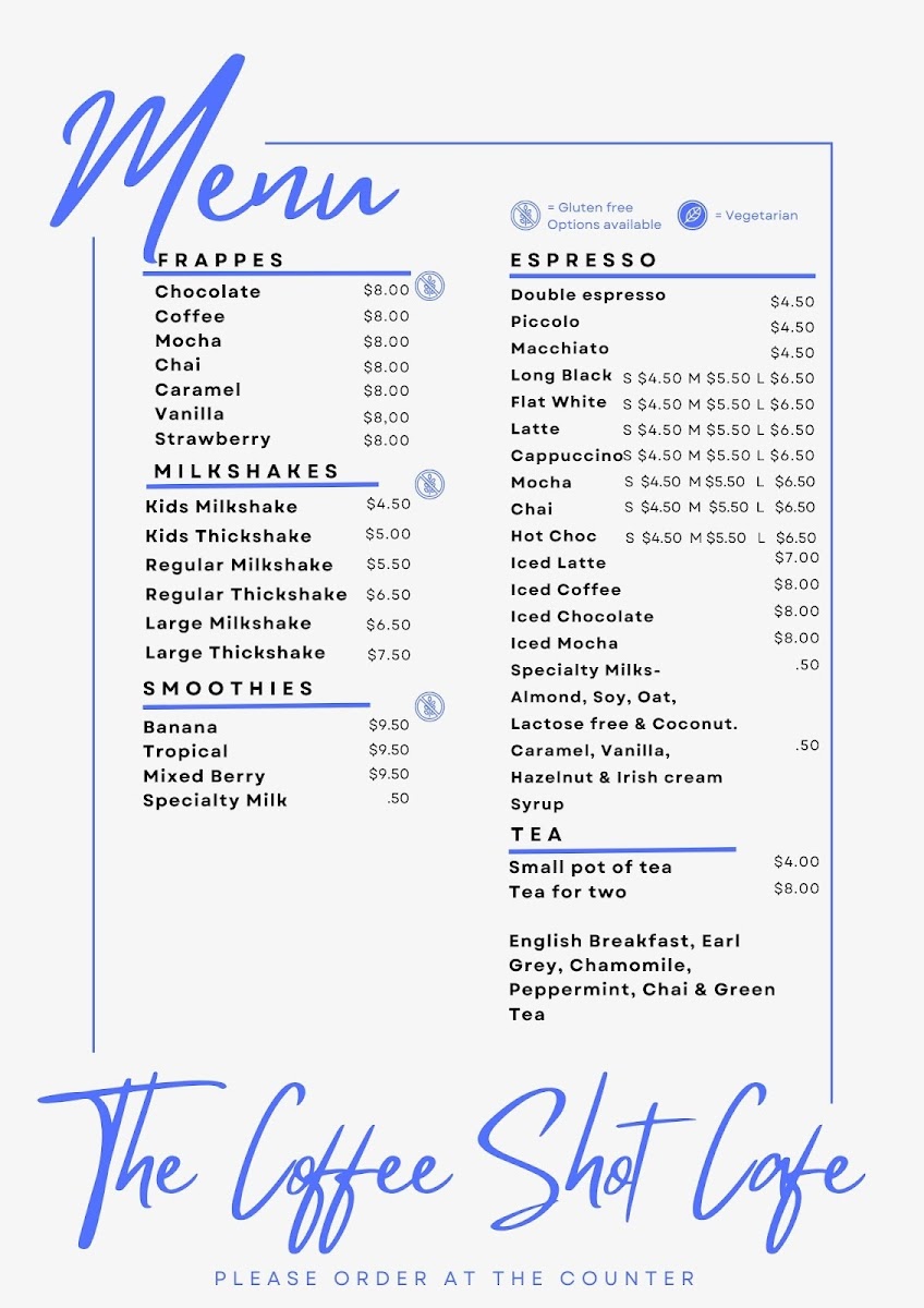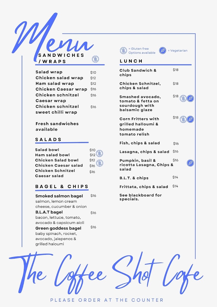 Additional menu highlights include items like the Sushi Bowl with Chicken Schnitzel and Toasted Ham & Cheese Sandwich, showing a blend of classic and more contemporary café offerings.