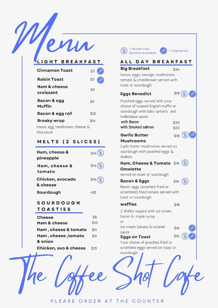 All Day Breakfast: This section includes classic breakfast dishes such as Big Breakfast, Eggs Benedict, Garlic Butter Mushrooms, Bacon & Eggs, Waffles, and Eggs on Toast, providing options for a substantial morning meal or a casual brunch.